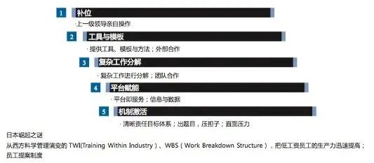 有一流的机制才有一流的人才、一流的业绩和一流的回报。这跟传统的模式不一样了,过去是有一流的业绩,才能有一流的回报,现在一定是先用机制吸引一流的人才,一流的人才创造一流的业绩,一流的业绩支撑一流的回报,一流的回报强化一流的机制。尤其是“85后”“90后”的年轻人,一定是先谈机制,把透明的机制谈清楚。这个是非常重要的。注意,有了机制还必须形成一定的“势差”,即华为提出的,“让高层有使命感、中层有危机感、基层有饥饿感”。华为的基层主要是利益激励,及时有效地激励,使其勇于担当,积极协同做岗位说明书以外的事;中层强调危机感,目标激励,实现目标激励队伍,激发潜力可以承受挫折和压力;高层靠使命感,确定方向和重点,提供正能量,消化负能量,关注中长期和可持续(见图2、图3)。组织建设当中的“核心秘密”是中国抗日军政大学的校训“团结紧张,严肃活泼”。彭剑锋教授有一篇文章专门谈这个问题。(《没有哪种组织管理理论,能超越毛泽东的这8个字》,《华夏基石管理评论》总第53辑116页——编者注)团结—紧张,严肃—活泼,看起来好像是冲突的,其实组织就是得这样“拧着”,才有张力:一面讲团结,另一面就要讲紧张;一面讲严肃,另一面要讲活泼。国民党退败到台湾以后,很多人在研究中国共产党为什么赢。据说蒋经国认为中国共产党的成功靠统一战线,但是有人说中国共产党的成功实际上是靠组织建设,其组织建设始终有一种紧张感,就是团结紧张,严肃活泼。每次内部整风运动后组织的战斗力就更强了,实际上就是造成了一种紧张感。当然,现在企业的紧张感不是整风运动,现在的紧张感更多的是来自市场的压力、业界的压力、任务的压力。通过一个“拉弗尔管”推动空气可以推动火箭;温柔的水通过一个高压孔却可以切断钢板,这就是“力出一孔”的力量。我们经常说,“力出一孔”要求个人在组织不要才华横溢。才华横溢是一个褒义词,但在组织当中往往是一个贬义词,就是太强调个人才华了,个人才华必须有一定的纪律约束、团队协同和平台放大才能创造价值。西方人研究日本为什么会崛起,包括“东南亚四小龙”企业的崛起,都是运用了从西方管理演变而来的TWI(Training Within Industry一线管理者技能培训),或者是WBS(Work Breakdown Structure即工作分解结构法),通过培训和能力提升计划,提高每个人的生产力,开发员工的大脑(见图4)。能力建设的最高境界是共享大脑,共享智慧,所谓的共享大脑就是融智,也就是参与决策,把知识沉淀,使知识平台化。文化是有结构层次的,所以文化变革的原则是三个“统一于”:当经营确定性比较强的时候,文化要统一于价值观;处于组织变革时期,文化要统一于“打粮食”,或者增加土壤肥力;当未来不确定的时候,文化要统一于使命愿景。一是强调文化的包容性,简单说就是企业要有底层思维,不要上纲上线;要有目标、有共识;文化本身也有场景的问题,在什么场景下倡导什么样的行为方式,这也很重要,只有在压力下、在冲突下,才能体现真正的文化。文化的包容性也体现为团队的多样性,人的个性不一样、能力有差异,都体现了文化的多样性。不包容的文化不利于人的创造力发挥和组织的适应性,所谓“和实生物,同则不继”。尤其在大疫情之后的环境里,企业进行文化建设要特别强调文化建设如何增加组织的适应性,文化不能整齐划一,要体现出多样性,这和原来讲的文化统一性是有矛盾的。在大变革当中讲文化的统一性,就是强调要想方设法“多打粮食”,增加土壤的肥力,强调面向未来有效经营、发挥潜力。总之文化到底统一到哪方面,由企业发展阶段来决定:企业目前是处于变革期,还是处于相对确定期,或者处于不确定期,这个判断和定位非常重要。要强调一下的是,在文化建设和思想统一的问题上,现在特别强调“文化的核”,通过每一个“核”来影响周边的团队,进而覆盖所有的员工,基层的班长和主管非常重要,他们就是文化建设的“核”,通过他们“引爆”最广泛的群众。