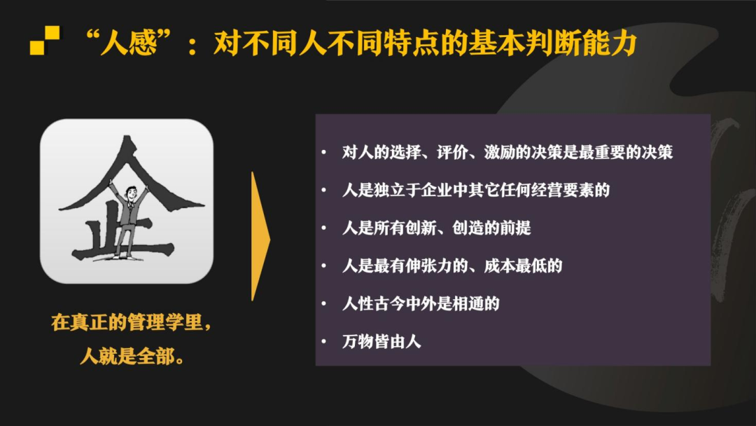 如何选人?这里面涉及“人感”的问题,即对不同人的基本判断能力。无论是经理还是普通员工,必须要有“人感”。有的人天生会对别人有所判断,有的人如何都训练不出来。比如,听音乐需要乐感,打高尔夫球需要球感,学英语需要语感,都是同样的道理。